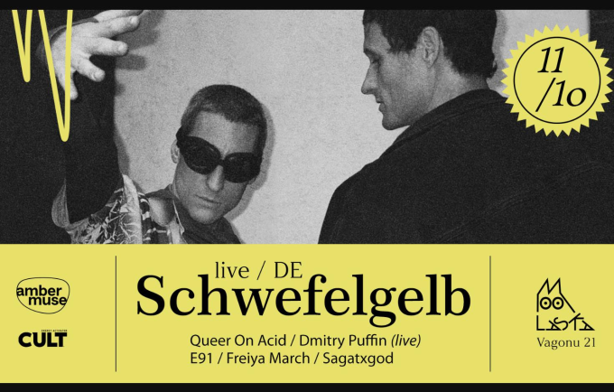 Schwefelgelb live in Riga - October 11 at Laska V21, hosted by Amber Muse The Berlin duo Schwefelgelb returns to Riga with a powerful live performance at Laska V21. Their shows are known for raw energy and immersive staging — a unique blend of industrial textures, analogue grooves, and hypnotic techno built from scratch with custom sound design.